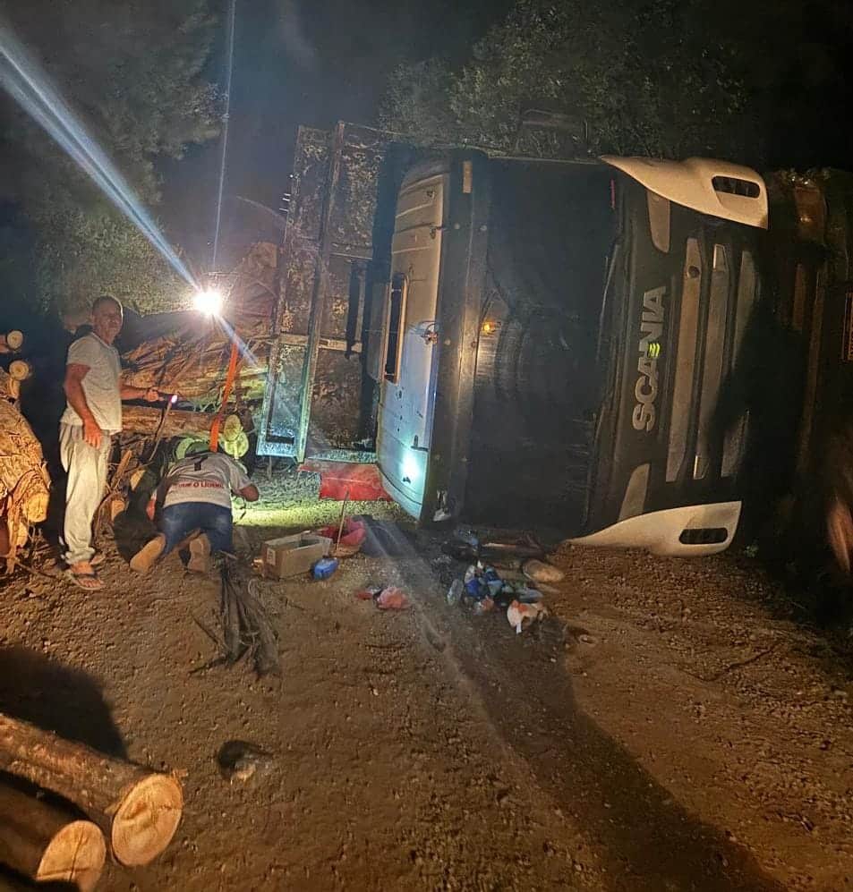 Duas pessoas morreram após um caminhão tombar sobre um veículo na Estrada da Santa Cruz, no município de Itaperuçu, Região Metropolitana de Curitiba, na noite deste sábado (22). O caminhão estava carregado com toras de madeira.