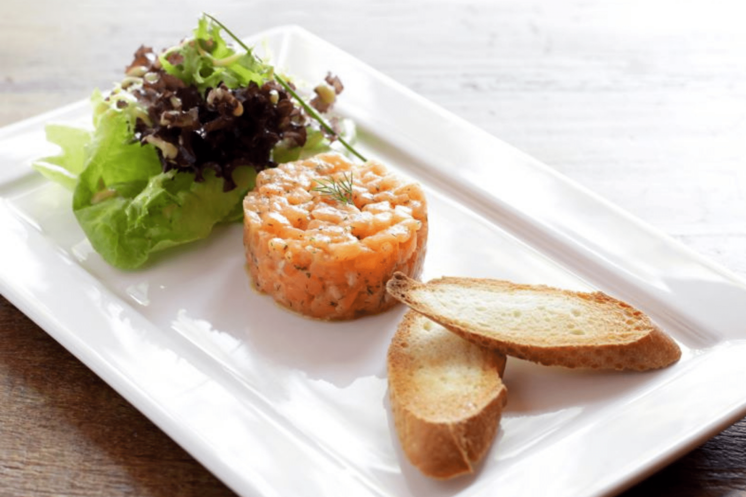 O menu da noite começa com Tartar de salmão e torradas (foto), acompanhado do fresco e aromático Esprit de Maison Blanche Reserve Sauvignon Blanc, da Famille Bouey, que representa o estilo vibrante dos brancos de Bordeaux.