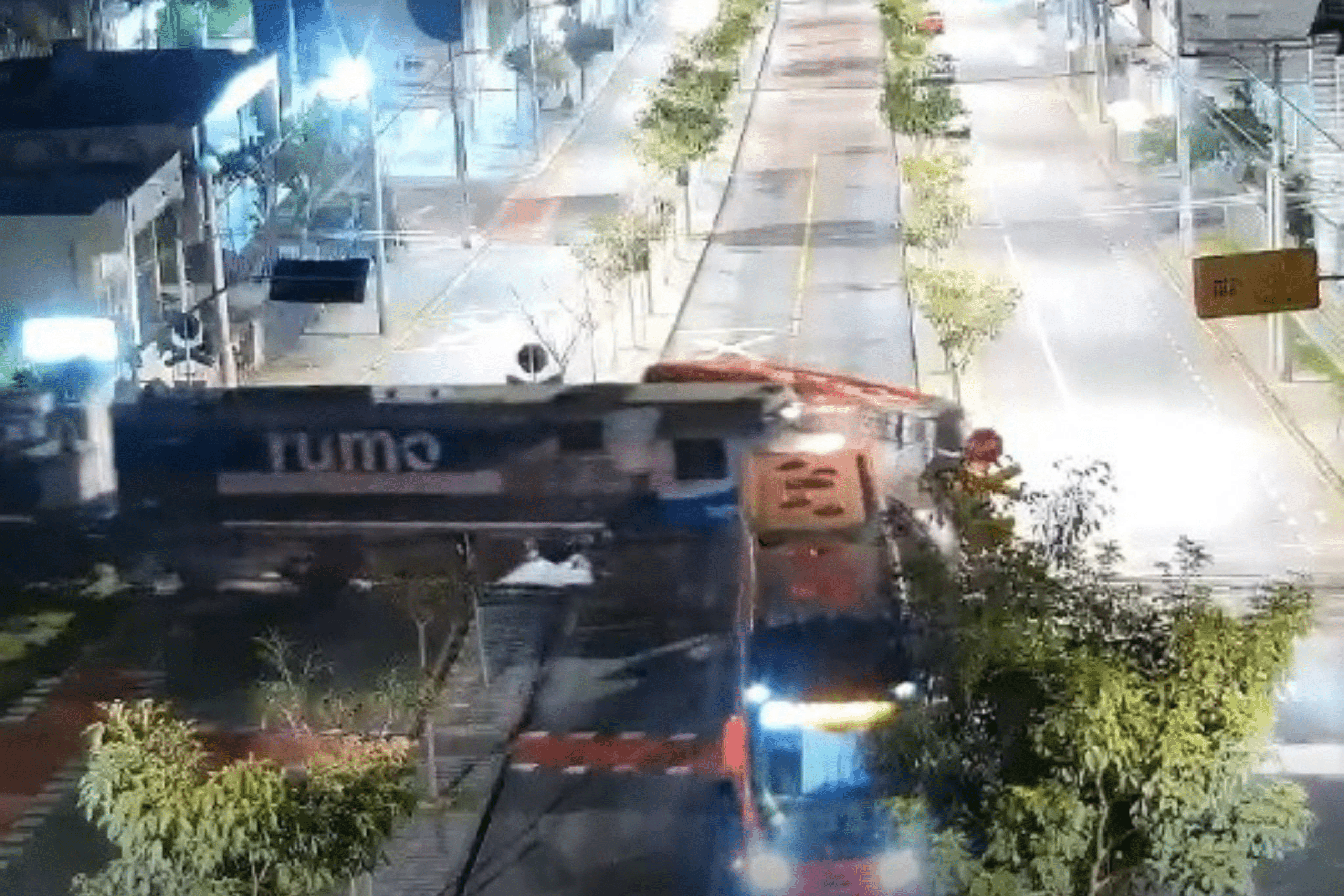 No vídeo, é possível ver de cima o momento exato da colisão, que quebra o coletivo. Os dois veículos se aproximam do cruzamento da avenida Paraná com a linha férrea, no bairro Cabral.