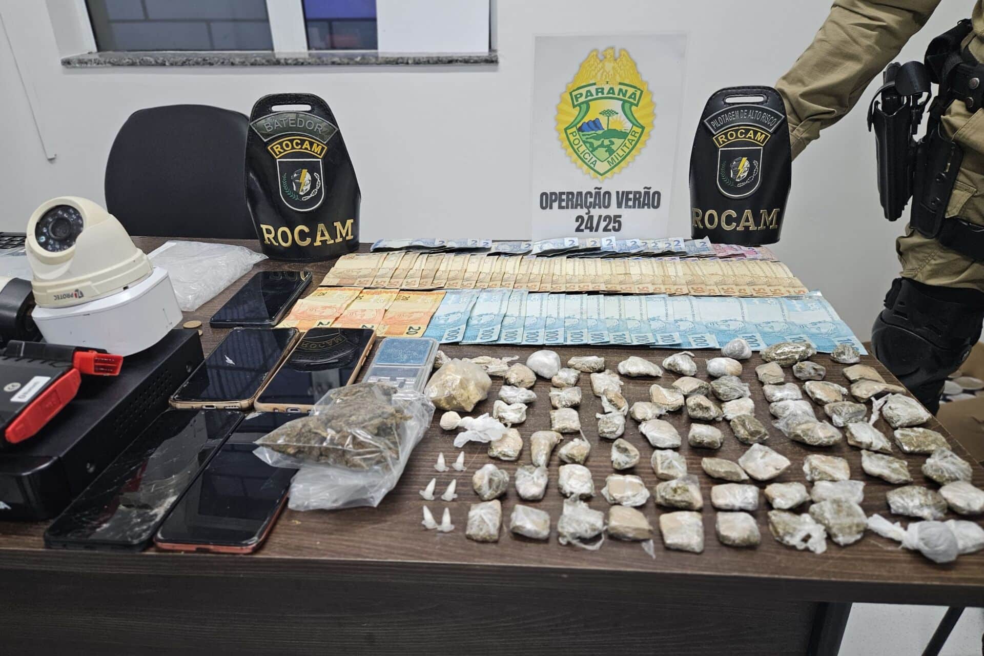 Os policiais informaram ainda ter apreendido 50 gramas de crack e cinco celulares. Foram apreendidos também duas câmeras de monitoramento, um gravador de vídeo e um scanner veicular. Os suspeitos foram encaminhados para a Delegacia de Polícia Civil.