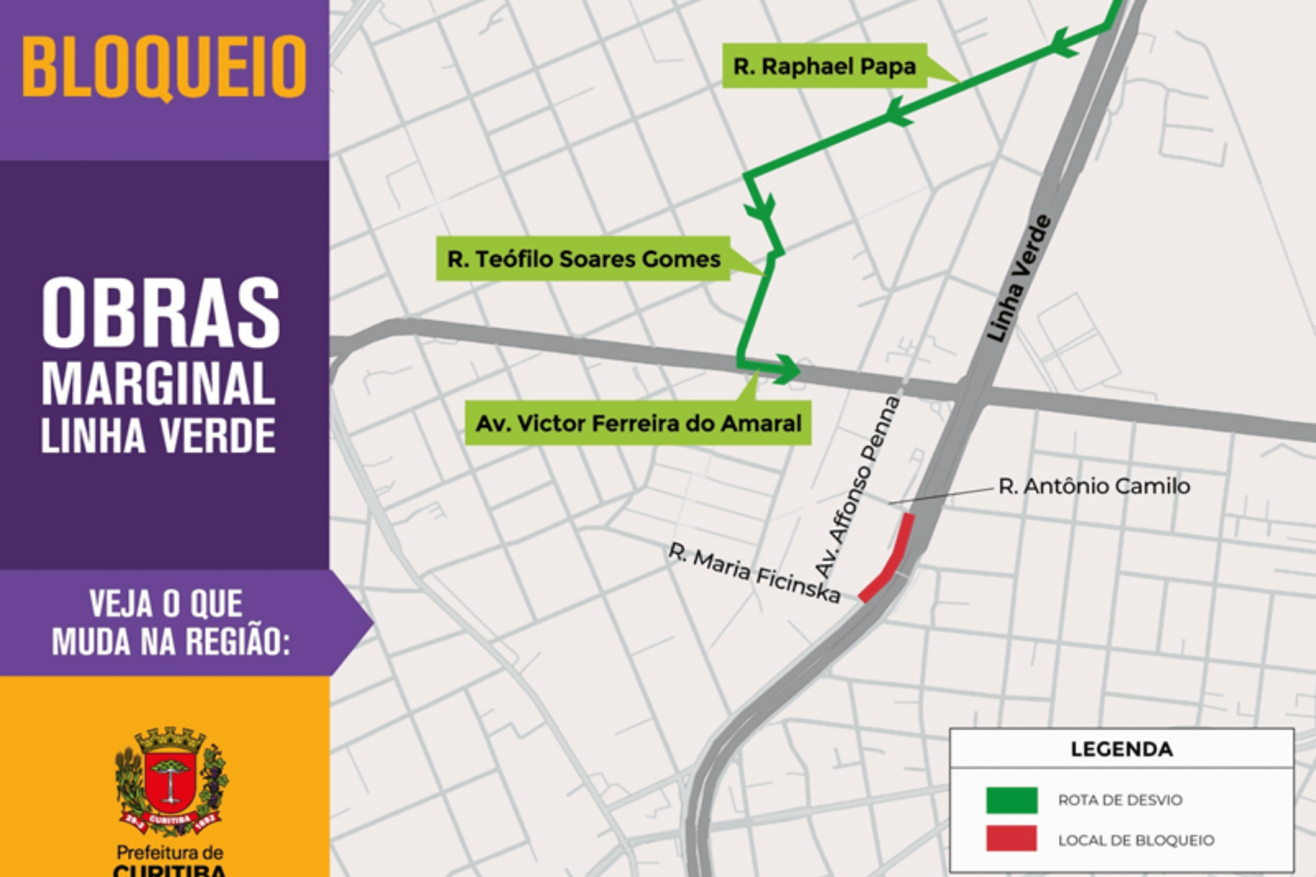 Nesta segunda-feira (30), o trânsito na Linha Verde terá alterações, com bloqueio total da via marginal entre as ruas Antônio Camilo e Maria Ficinska, acesso ao bairro Tarumã. Segundo a prefeitura, a duração prevista do bloqueio é de 60 dias.